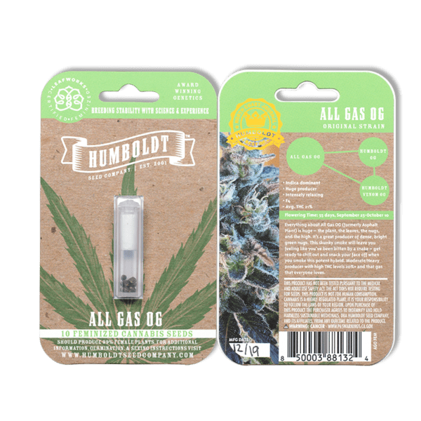 Everything about All Gas OG (formerly Asphalt Plant) is huge – the plant, the leaves, the nugs, and the high. It’s a great producer of dense, bright green nugs. This skunky smoke will leave you feeling like you’ve been bitten by a snake – get ready to chill out and snack your face off when you smoke this potent hybrid. Moderate/Heavy producer with extremely high potency levels and that gas that everyone loves.