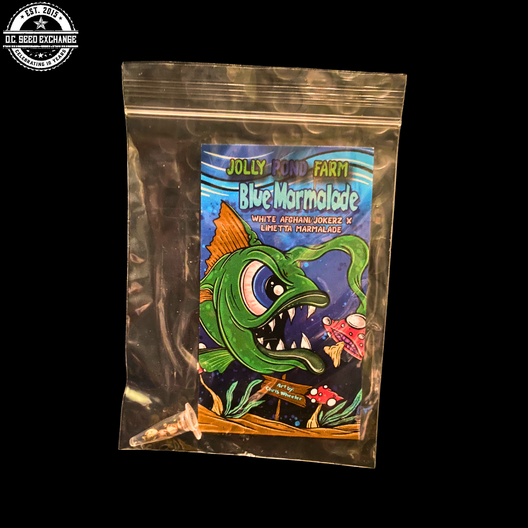 Blue Marmalade is an exquisite Hybrid cross bred by Jolly Pond Farms. This feminized variety combines the complex, high-performance genetics of White Afghani/Jokerz with the flavorful Limetta Marmalade.