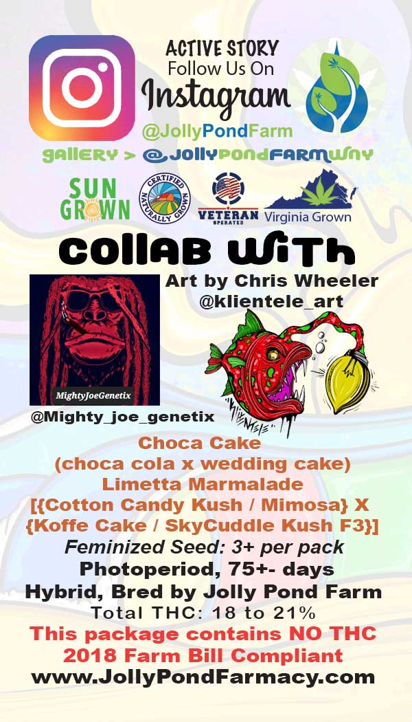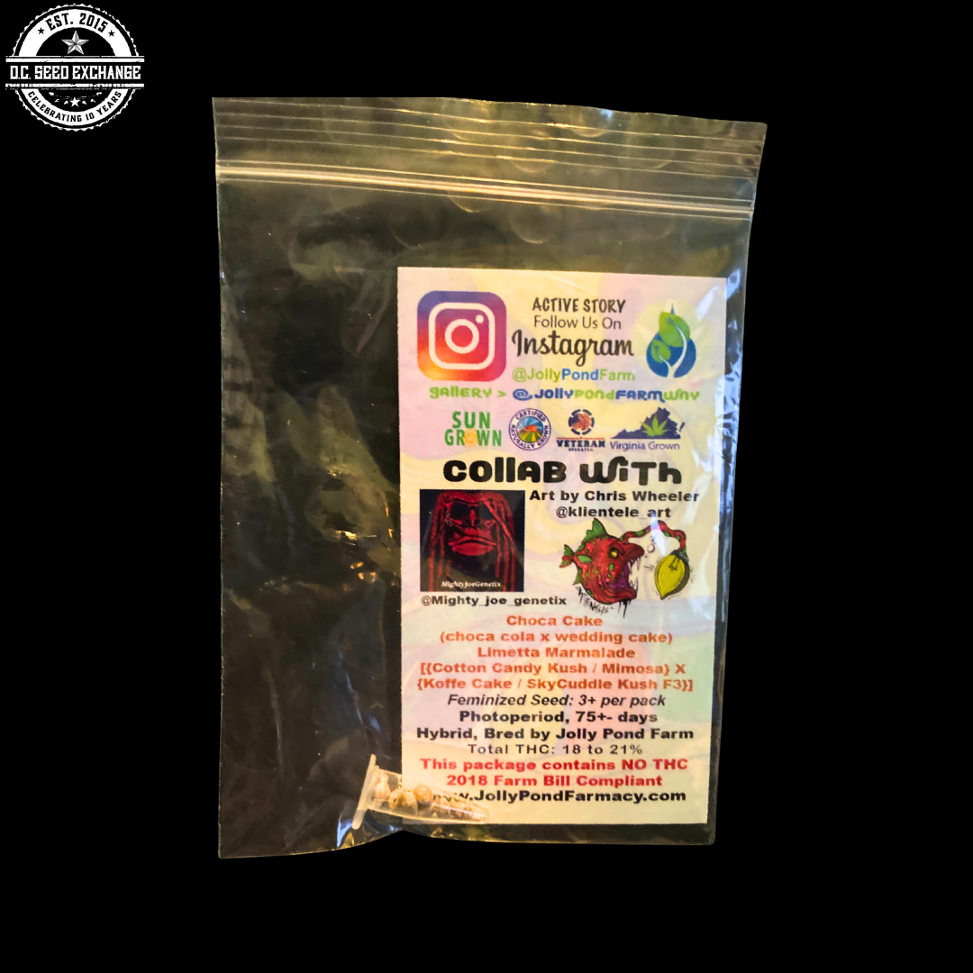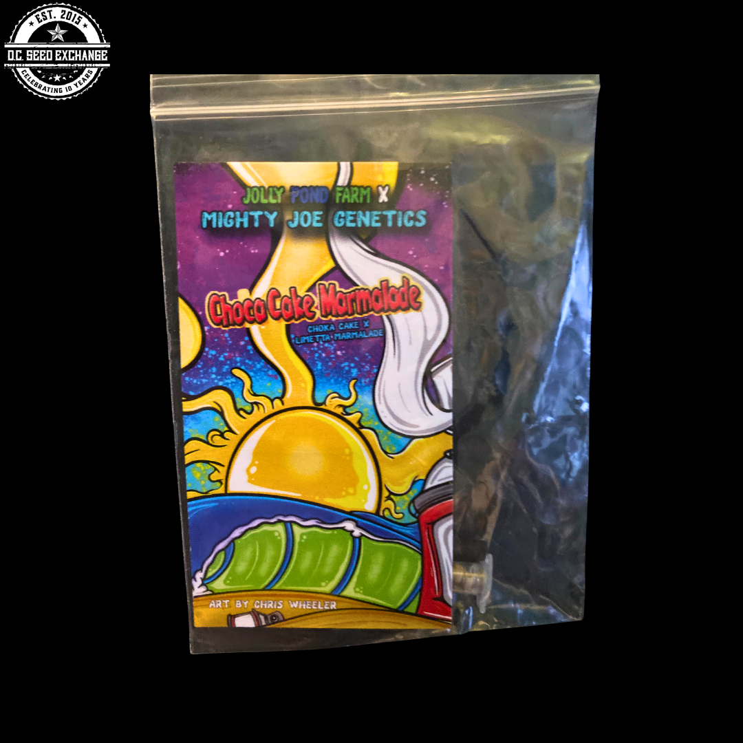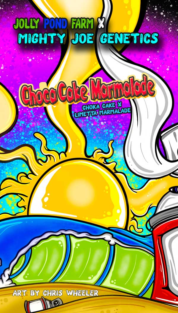 ChocoCake Marmalade is a decadent Hybrid cross bred by Jolly Pond Farms in collaboration with Mighty Joe Genetix (@Mighty_joe_genetix). This feminized variety blends rich dessert flavors with zesty complexity, combining Choca Cake with the flavorful Limetta Marmalade.