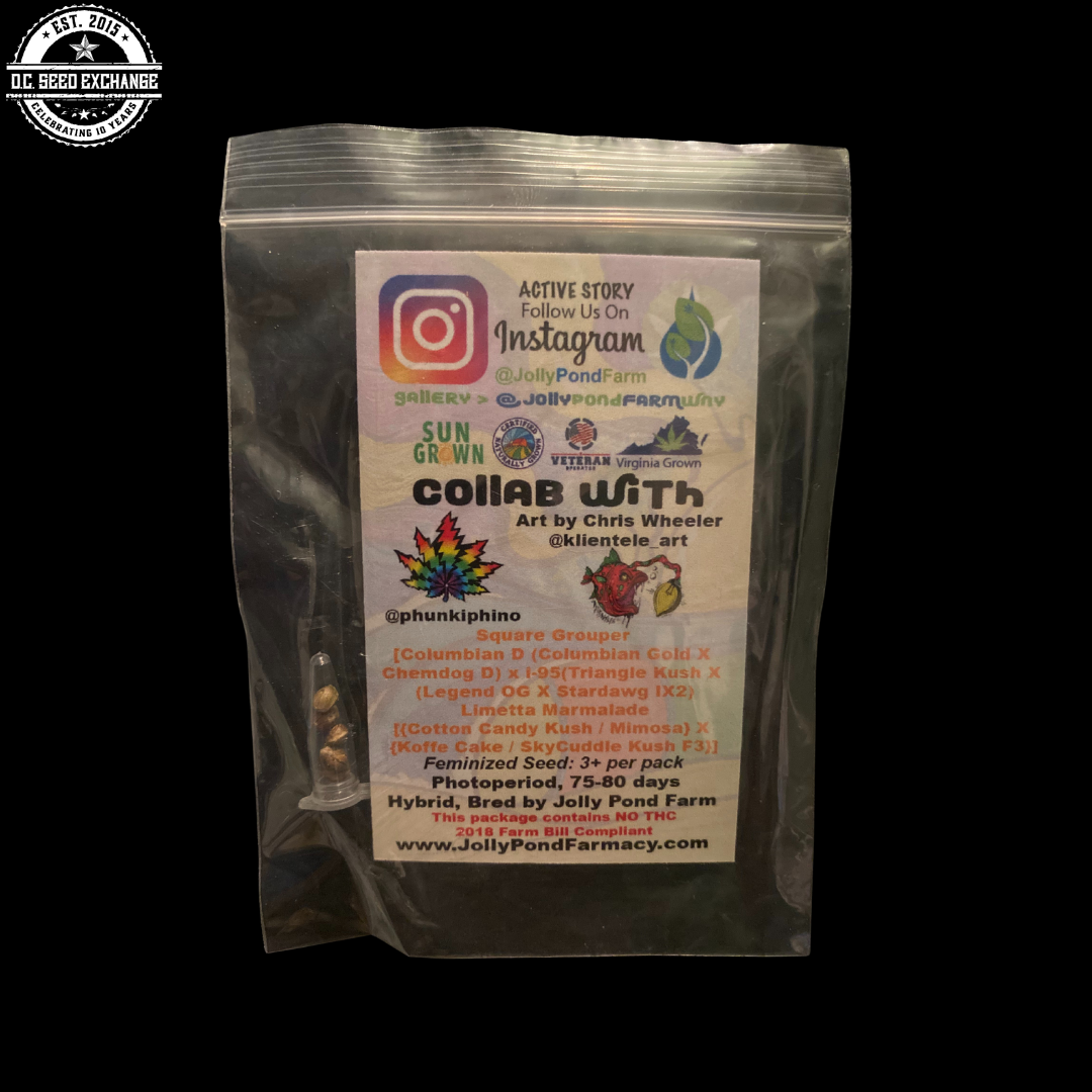 Square Grouper: A heavy-hitting mix of Colombian D (Colombian Gold x Chemdog D) and 1-95 (Triangle Kush x Legend OG x Stardawg IX2). This parent contributes intense gas, potency, and classic Columbian Gold sativa traits.