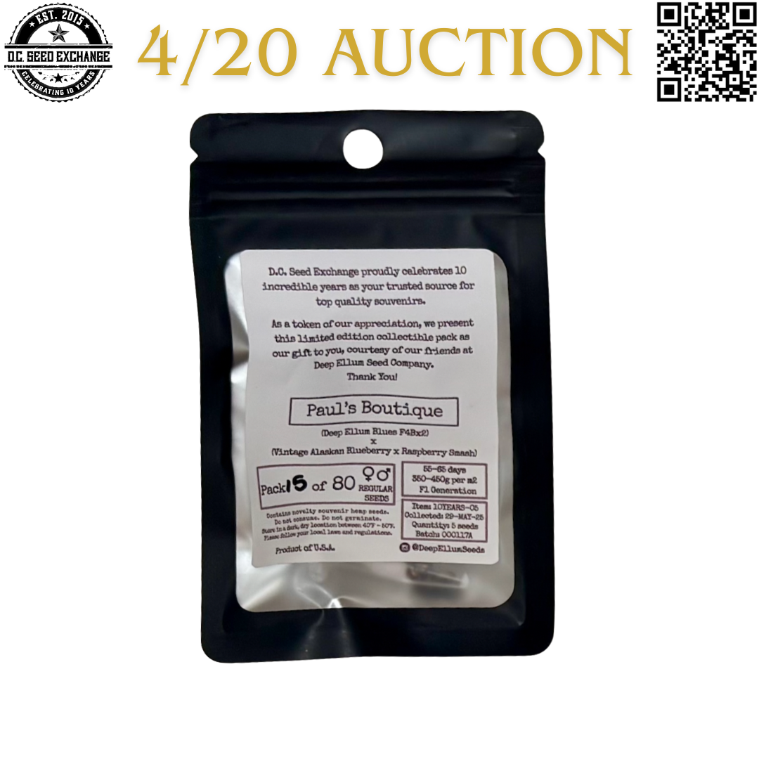 You are bidding on one hand-numbered pack of Deep Ellum Seed Company’s Paul’s Boutique F1 (Deep Ellum Blues F4Bx2 x [Vintage Alaskan Blueberry x Raspberry Smash]) 5 Limited Edition Regular Photoperiod Seeds!