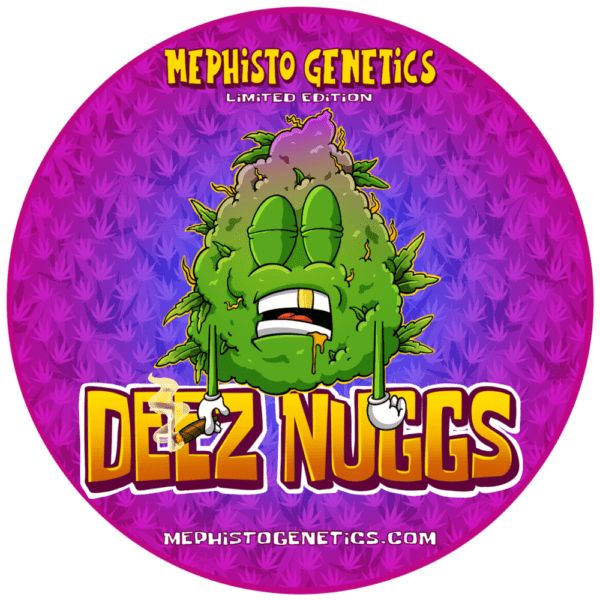 Deez Nuggs typically runs as a squat and stout cultivar, some growers can coax a medium-sized bush out of her, but we like to think of Deez Nuggs in the Mephisto HQ as one of our ultimate head stash varieties. To max out yield they can be positioned at higher densities than usual to create an even canopy, absolutely riddled with chunky nuggsites. She can be topped and LST’d however we’ve found the best way is to just periodically leaf tuck during the vegetative stage to encourage the secondaries. Where Deez Nuggs really gets on song, however, is she’s a proper terpene dream, emitting beautiful aromas; a magnificent concoction of gas, fruit, orange and strawberries all smashed together. Talking of smashing, Deez Nuggs ranks incredibly high on our scale as an outright resin factory, she’s amazing to wash or squash and returns generously. We’ve been itching to progress Deez Nuggs from the F1 Illuminauto from a few years ago to the F3 Limited so more customers can experience her as she’s certified primo top-shelf chronic.