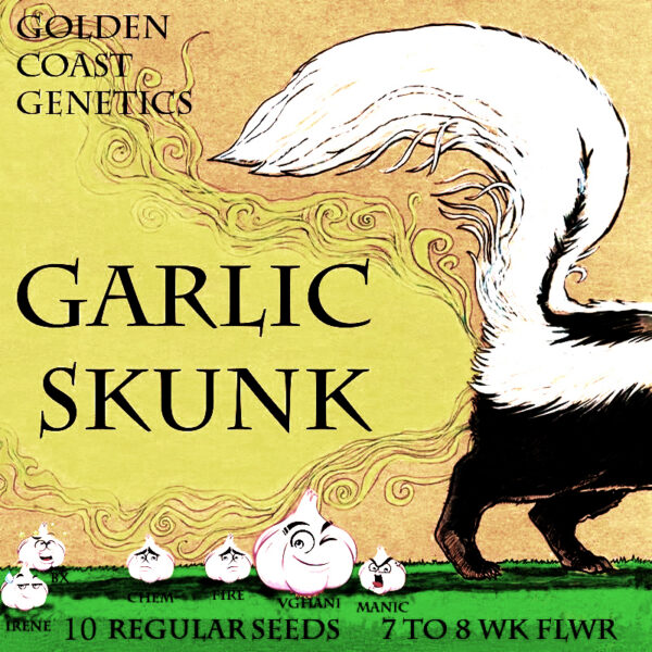 Golden Coast Genetics’ Garlic Skunk is a BX photoperiod cross of (Vghani x Chem Fire) x (Manic X Irene).