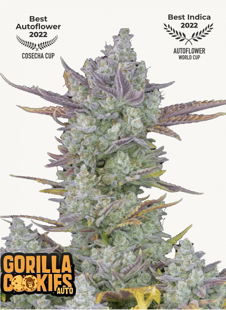 A powerful combination of our top autoflowering strains of all time. Probably one of the most potent autoflowering strains to date. Gorilla Cookies takes on all the best qualities of her parent strains, making her something very special for all growers. As a balanced hybrid of Sativa and Indica, she performs incredibly well both indoors and outdoors while still being super-reliable and resilient to the elements. This strain is a massive producer, making it perfect not only for novices but also for commercial growers looking for potency, yield, and taste. Growers can expect around 600gr/m2 of extremely dense golf-ball-sized buds. The impressively high THC levels translate into an intense resin production making her buds almost completely white and covered in trichomes late in the flowering stage. This is a great choice for making all types of extractions not only for the quantity and quality of resin she produces but also for the exceptional aroma she reeks of.