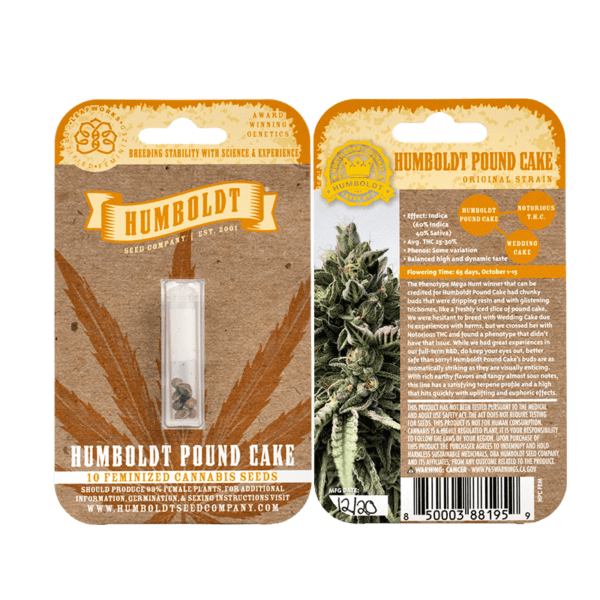New for 2021, Year of the Exotics! The Phenotype Mega Hunt winner that can be credited for this strain had chunky resin dripping buds and glistening trichomes, like a fresh iced slice of pound cake. We were hesitant to breed with Wedding Cake due to experiences with herms, but we crossed her with Notorious and found a phenotype that didn’t have that issue. While we had great experiences in our full-term R&D, do keep your eyes out, better safe than sorry! Humboldt Pound Cake’s buds are as aromatically striking as they are visually enticing. With rich earthly flavors and tangy almost sour notes, this line has a satisfying terpene profile and a quick high with uplifting and euphoric effects.