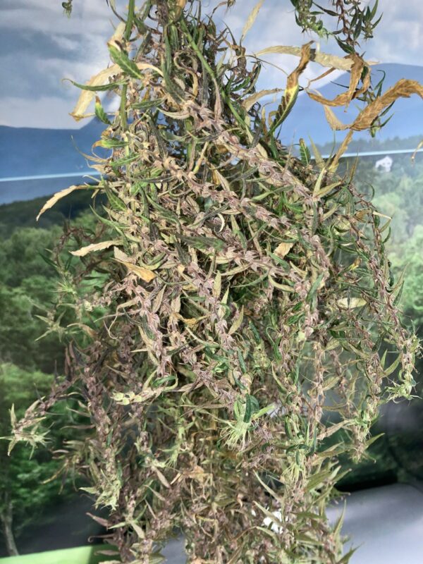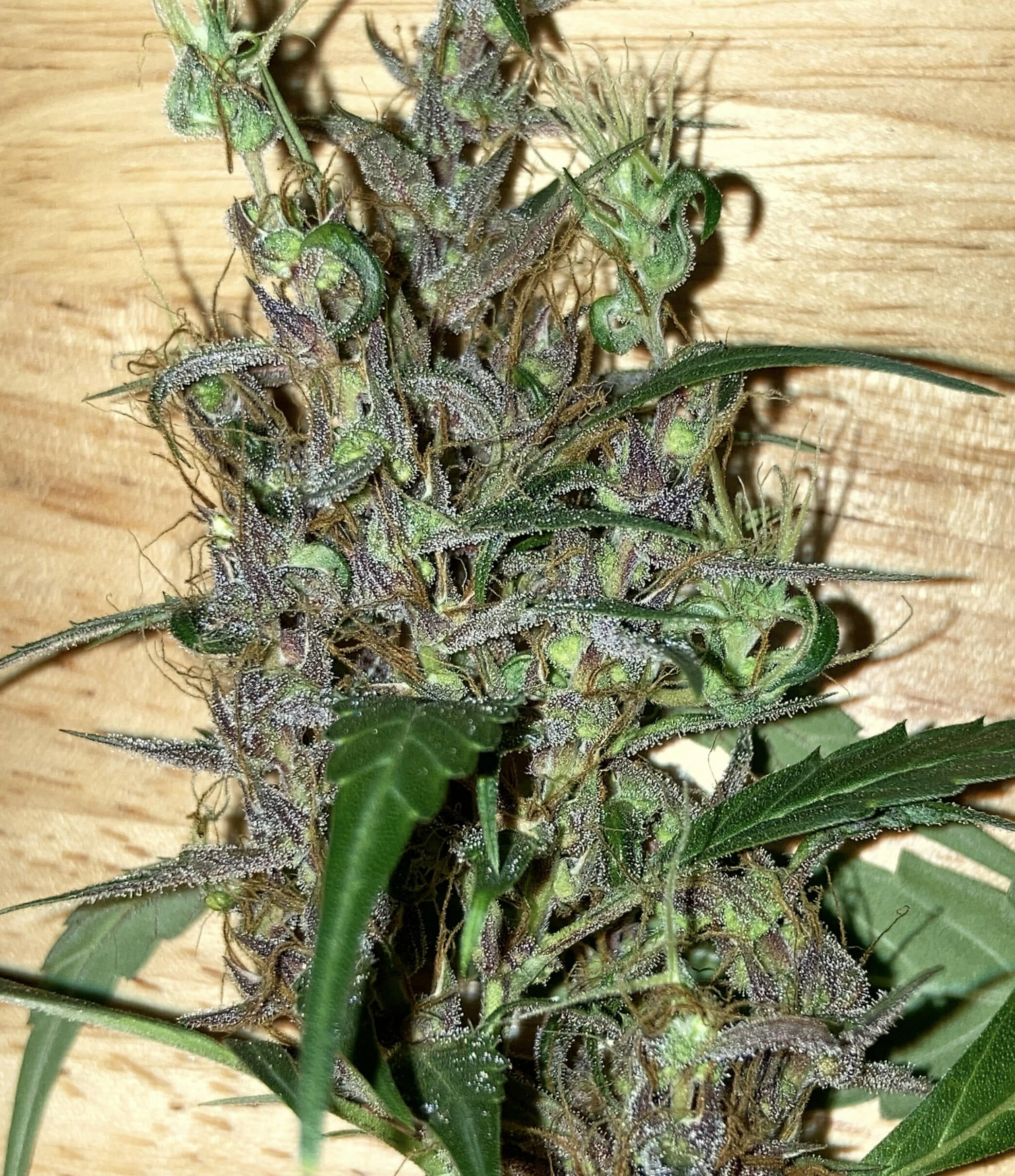 This genuinely pure sativa has absolutely no indica influence, which cannot be said about most typical plants these days! It offers a very unique experience that makes this strain worth growing even with its longer flower time of 13 weeks. A plus side to this flower time is the reduced veg time needed, because they do so much growth in flower, it is possible to sprout them directly in your flower room of 11/13 lighting, and they will begin to flower around 3 weeks in and stretch to approx 5 feet tall without being topped. You can use topping and training to create a smaller plant to fit nearly any grow style. This strain seems to prefer lower light levels than many sativa plants do! This may be because of the frequently overcast weather in the region it comes from. Buds seem to flower “forever” with the inside, lower, and earlier buds ripening first, with tips always showing new flowering. I’ve tested various parts of the plant and determined that after approx 13 weeks of flowering, is the best time to harvest and the inner ripened flower tests much higher than the new green tips that continue emerging. The strain is a light feeder and is very easy to grow multiple plants per pot in a water-only organic supersoil in a 3 gallon fabric pot! Flowers turn purple as they ripen.