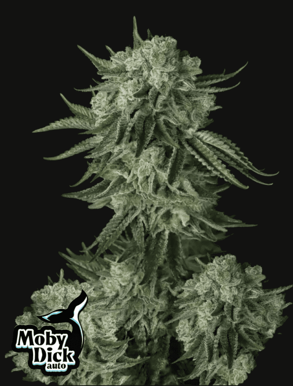Moby Dick Auto grows long and big dark-green buds with even darker sugar leaves and long dark-orange hairs scattered all over. Expect really thick, dense flowers with a heavy coat of resin from head to toe that sparkles under the right lighting. The outstanding bag appeal comes hand-in-hand with a pleasing yet intriguing earth, lemony, and sweet floral aroma that will make your whole room smell like a Dutch coffee shop as soon as you break the buds open.