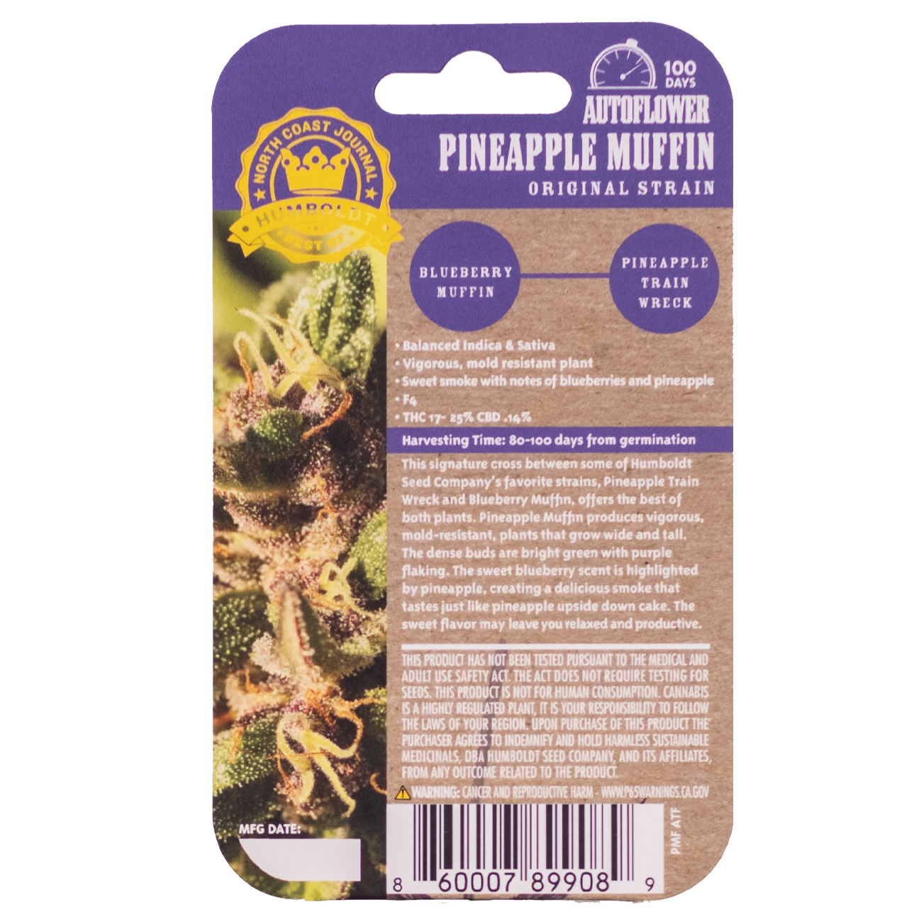 This signature cross between some of HSC’s favorite strains, Pineapple Train Wreck and Blueberry Muffin, offers the best of both plants. Pineapple Muffin produces vigorous, mold-resistant, plants that grow wide and tall. The dense buds are bright green with purple flaking. The sweet blueberry scent is highlighted by pineapple, creating a delicious smoke that tastes just like pineapple upside-down cake. The sweet flavor may leave you relaxed and productive.