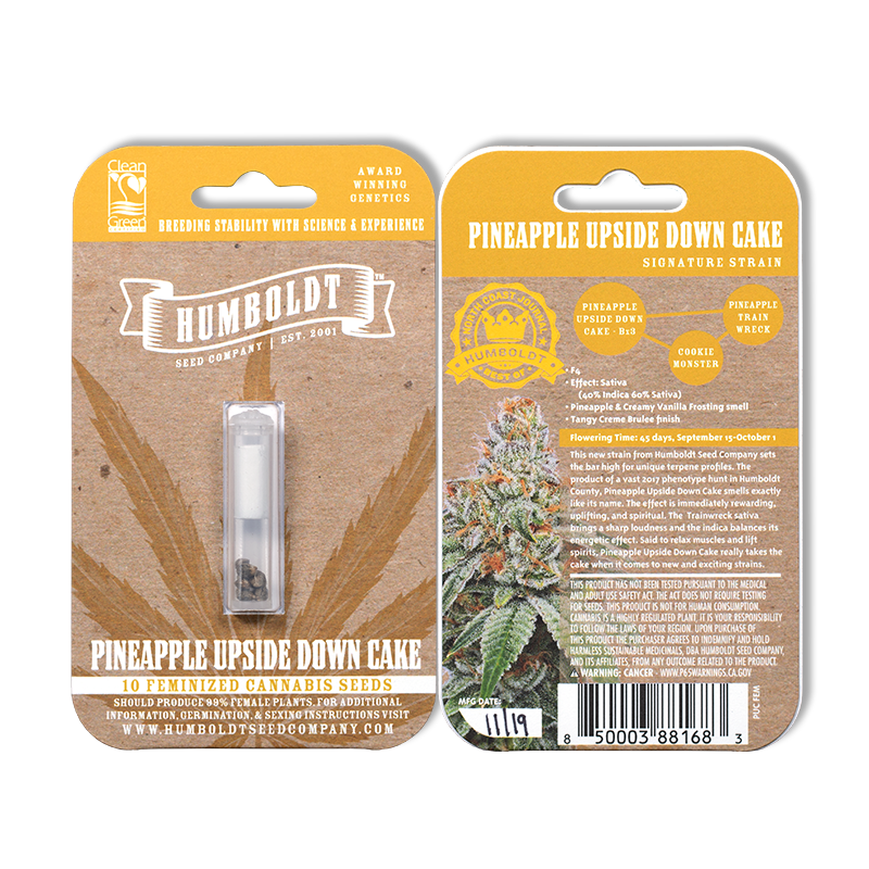 This new strain from Humboldt Seed Company sets the bar high for unique terpene profiles. The product is a vast 2017 phenotype hunt in Humboldt County, Pineapple Upside Down Cake smells exactly like its name. The effect is immediately rewarding, uplifting, and spiritual. The Trainwreck Sativa brings a sharp loudness and the Indica balances its energetic effect. Said to lift spirits, Pineapple Upside Down Cake really takes the cake when it comes to new and exciting strains.