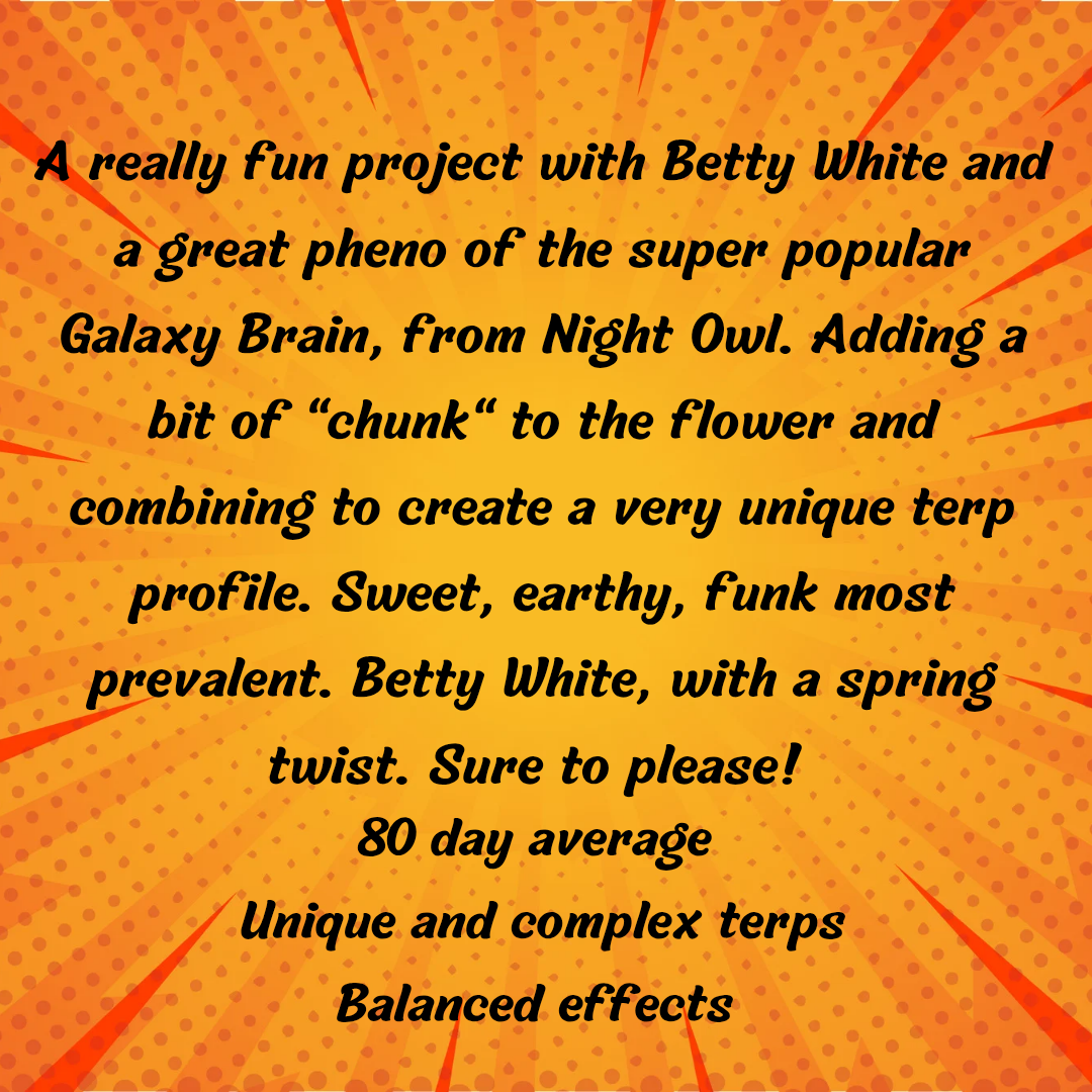 Sirius B is a delightful project blending Betty White with a standout Galaxy Brain phenotype from Night Owl Seeds. This cross aims to add density to the flower while creating a unique terpene profile, with sweet, earthy, and funky notes taking center stage – a refreshing twist on Betty White.
