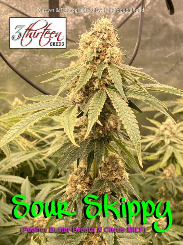 3Thirteen Seeds “Sour Skippy” is a Feminized F1 cross of Peanut Butter Breath and HydroRed’s Citrus MILF (Mothers Milk x Plemon) rev.