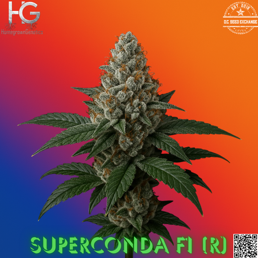 Description: Superconda boasts chunky, deep purple buds with pepper-shaped emerald-green highlights and golden-white trichomes. Its flavor profile combines fruity apple, earthy banana, and a kick of spicy black pepper. Known for its euphoric, giggly, and creative effects, it gradually transitions into a soothing body high perfect for unwinding. Dominant terpenes include myrcene, limonene, and beta-caryophyllene, making it an excellent choice for relaxation and relieving stress or anxiety.