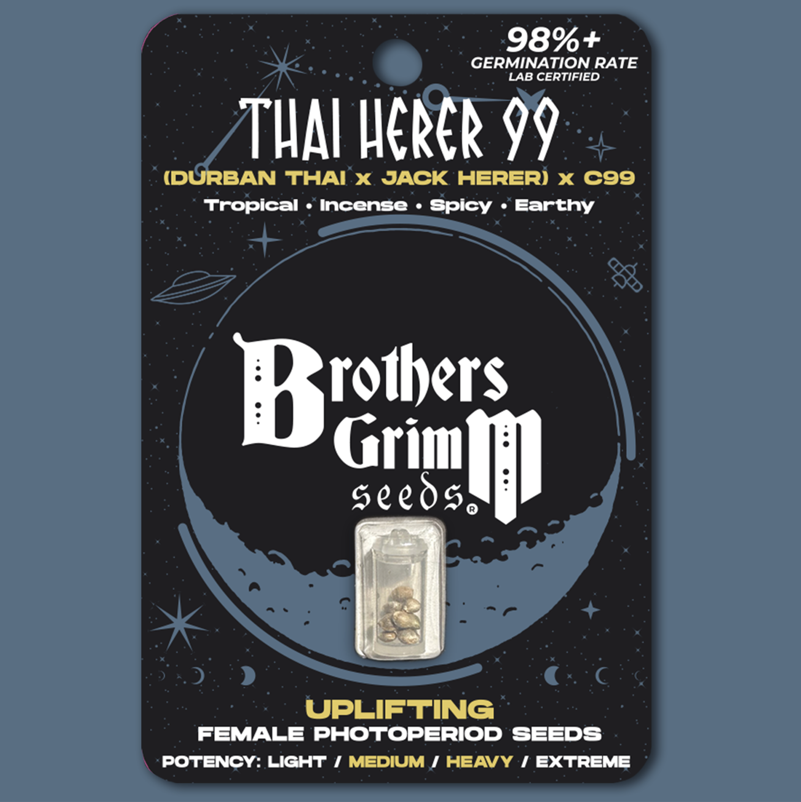 Brothers Grimm Thai Herer 99 (formerly Durban Nights) grows into dense flowering plants with exotic spicy tropical aromas and stocky, strong structure. These are big, vigorous plants with tons of resin on a large main cola and heavy, yet strong side branches. The Durban Thai lineage includes the Durban-Thai Highflyer from SSSC circa 1988, and the Jack Herer was originally from Sensi Seeds. We then reversed our favorite Cinderella 99 female and pollinated the DT x JH female to create these 100% female seeds of Thai Herer 99.